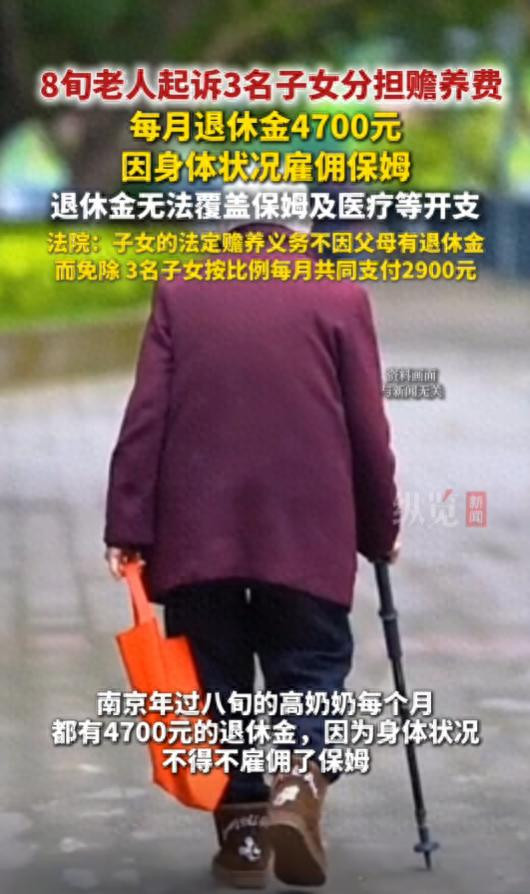 八旬老人每月退休金4700元, 3子女拒付赡养费! 老人告上法院: 要求分担保姆费